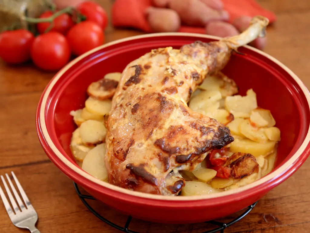 pomme de terre, tomate, moutarde de dijon, crème fraîche, huile, ail, poivre, sel, cuisse de dinde