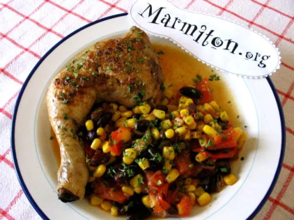 lorsque le poulet est cuit, mettre les chips 5 minutes au four normal, dans le deuxième plat. dresser les asiettes avec petits pois, chips et cuisse de poulet, le tout recouvert de sauce.