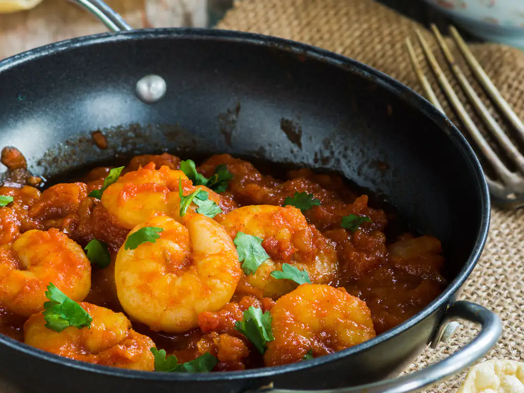 curry, sel, piment, ail, coriandre, amandes effilées, crevettes, lait de coco, pâte de curry