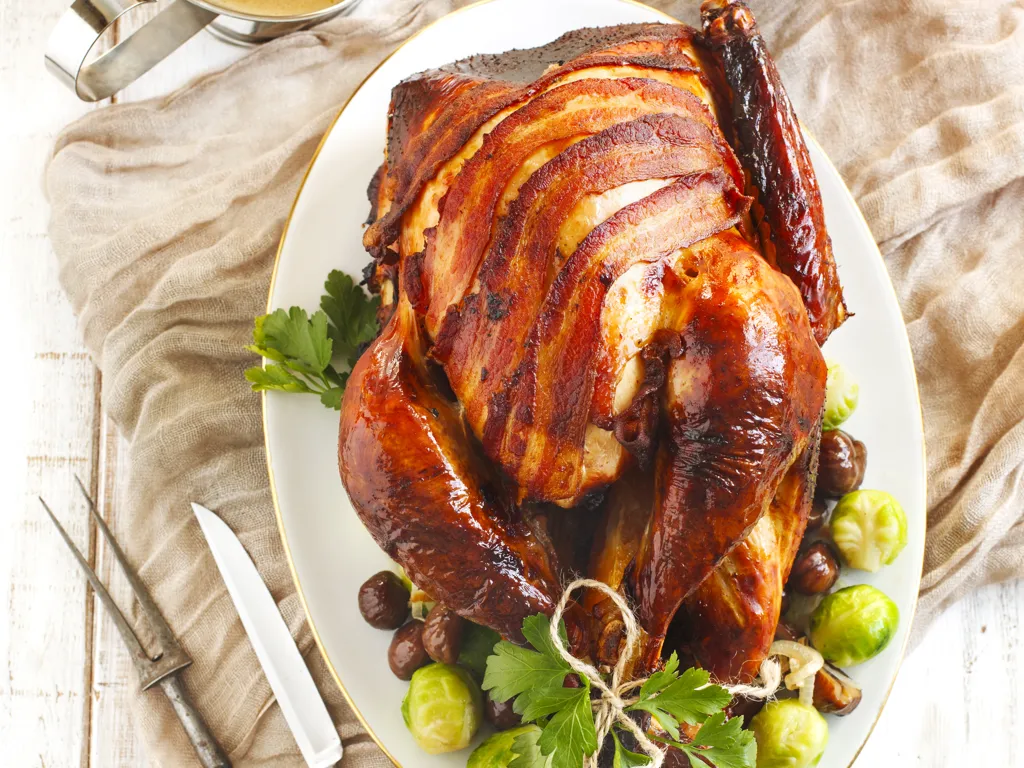 saler et poivrer l'intérieur de la dinde puis la rouler dans un mélange de sel et poivre afin qu'elle soit bien assaisonnée. l'envelopper ensuite de tranches de lard, puis la ficeler pour bien maintenir le tout.