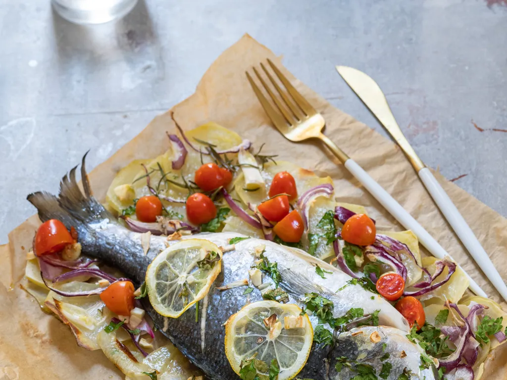 une fois cuites, les dorades doivent être séparées de leur tête et de leur queue avant d'être servies avec des pommes-de-terre au beurre et persil ou avec des nouilles au beurre.