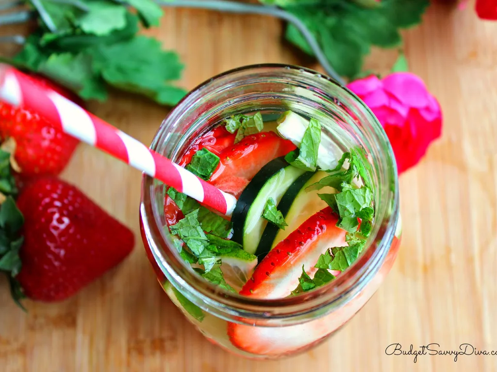 eau, citron, fraises, framboises, menthe, glaçons