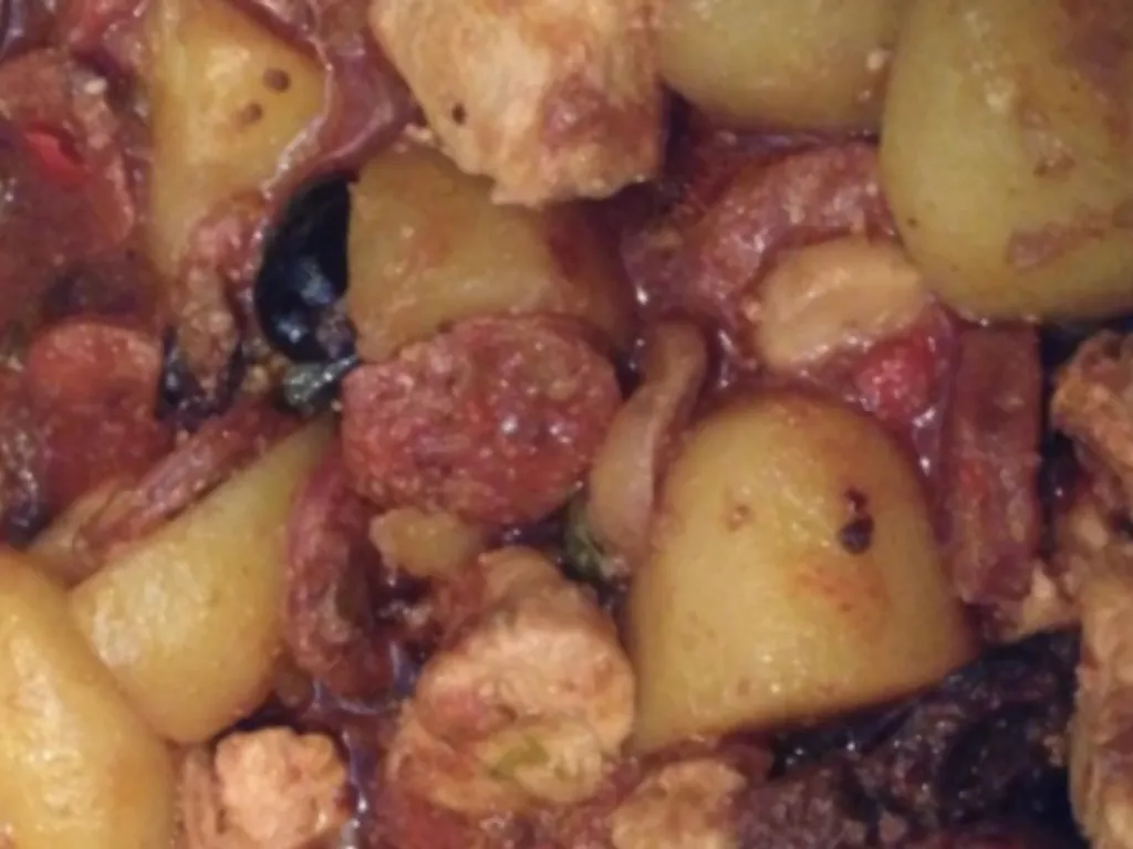 pomme de terre, lardons, concentré de tomates, huile d'olive, porto, sel, poivre, échine de porc, olives noires