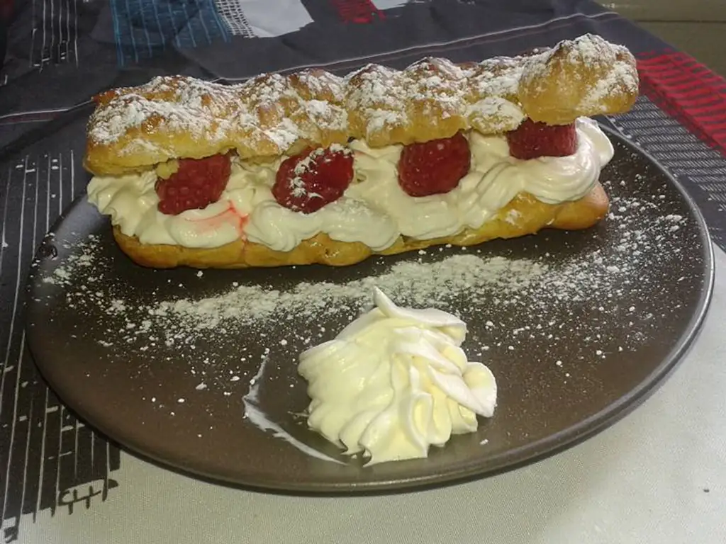 verser la chantilly dans une poche à douille, puis dresser sur l’éclair, ajouter les framboises sur la chantilly, refermer en mettant le chapeau de l’éclair, parsemer un peu de sucre glace pour la déco. déguster.