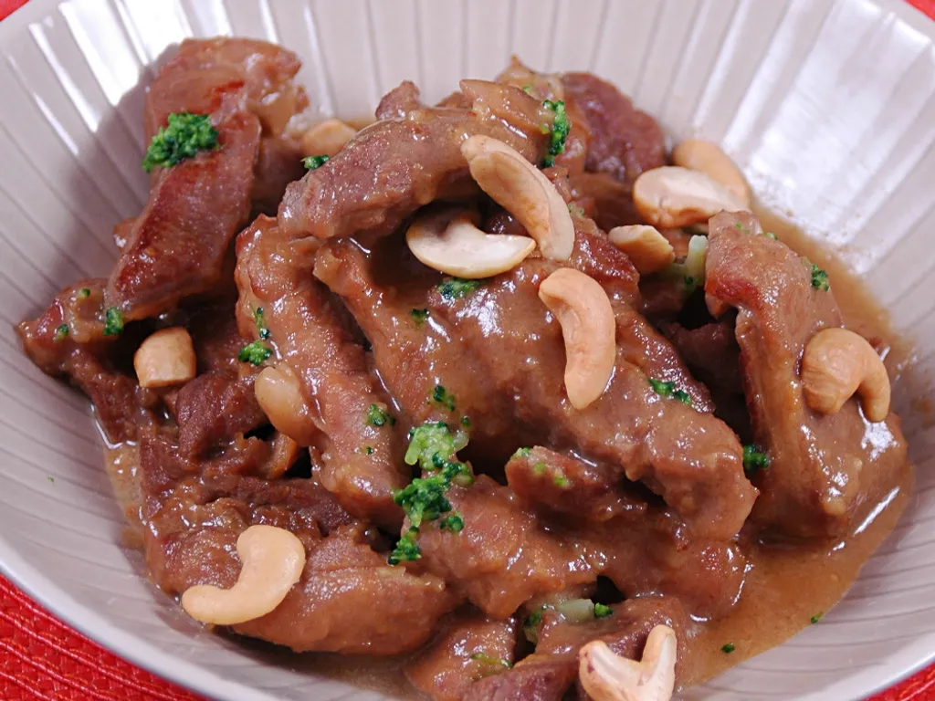noix de cajou, sucre, huile d'arachide, cube de bouillon, eau, escalope de porc, sauce soja