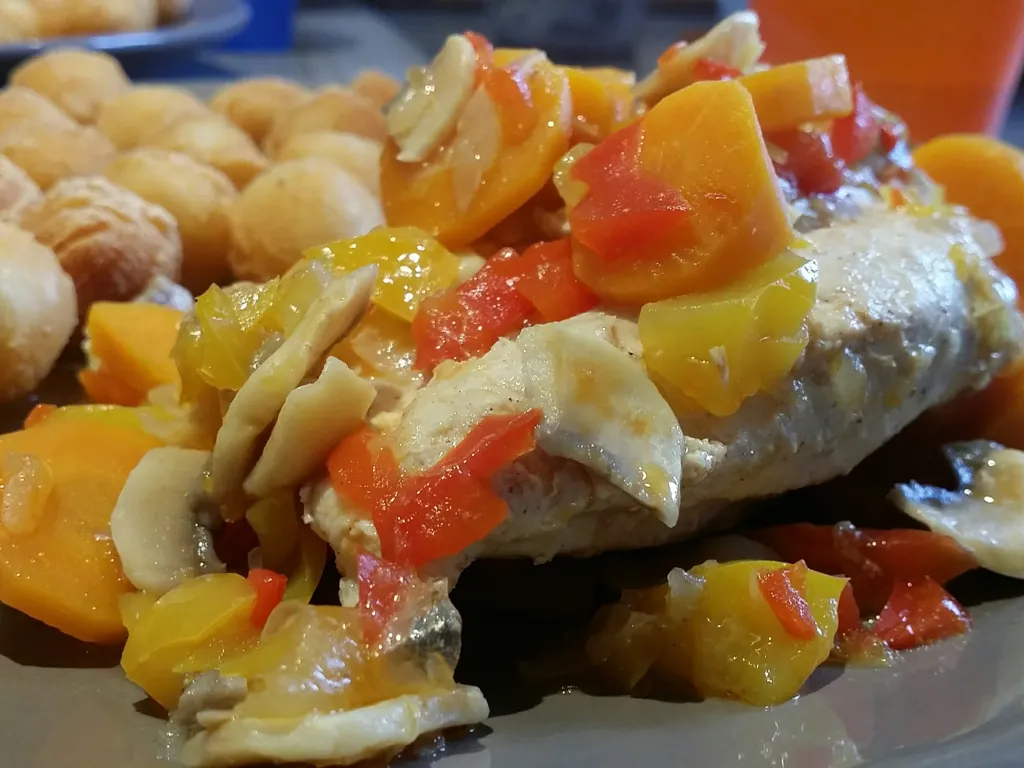 beurre, champignon de paris, carotte, poivron rouge, paprika, crème fraîche, citron, poivre, sel, oignon blanc, bouillon de volaille, escalope de poulet