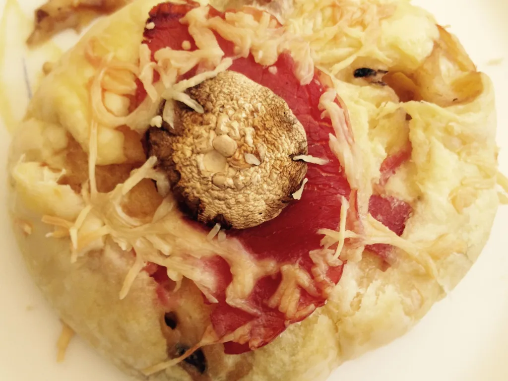etalez la moitié de la pâte feuilletée en un rectangle de 25 cm de longeure et 15 cm de largeur environ. mettre celle-ci sur la plaque à pâtisserie et mettre une couche de jambon, de la sauce et des lamelles de champignons et ainsi de suite jusqu'à la fin des ingrédients. laisser une bordure pour pouvoir étaler l'autre moitié de la pâte et souder les bords avec une fourchette.