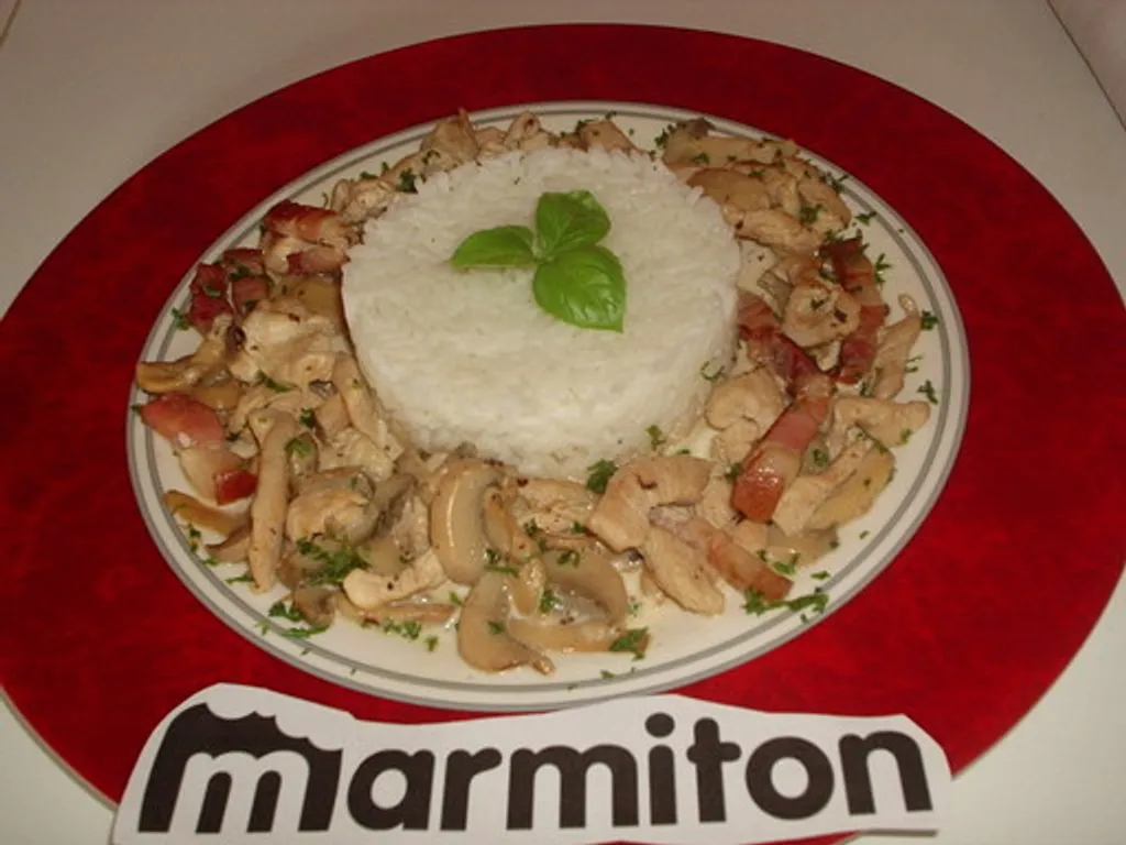 champignon, crème fraîche, fond de veau, poivre, sel, escalope de dinde, lardons fumés