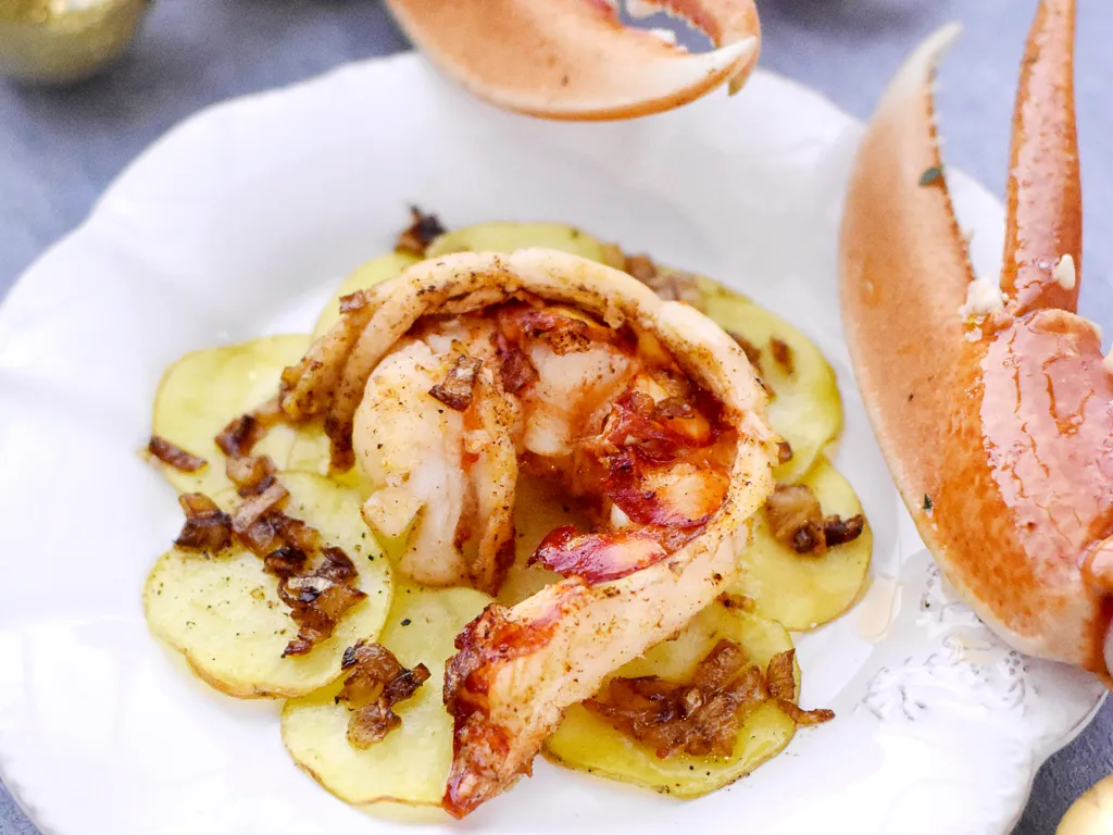 pomme de terre, huile d'olive, poivre, sel, bouquet garni, beurre, gros sel, homard, échalote