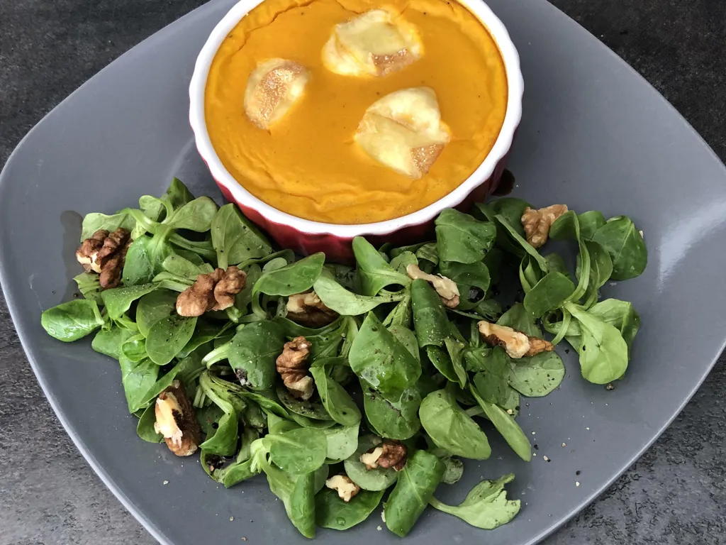 farine, curry, muscade, beurre, beurre, potimarron, oeuf, crème liquide, maroilles, sel et poivre