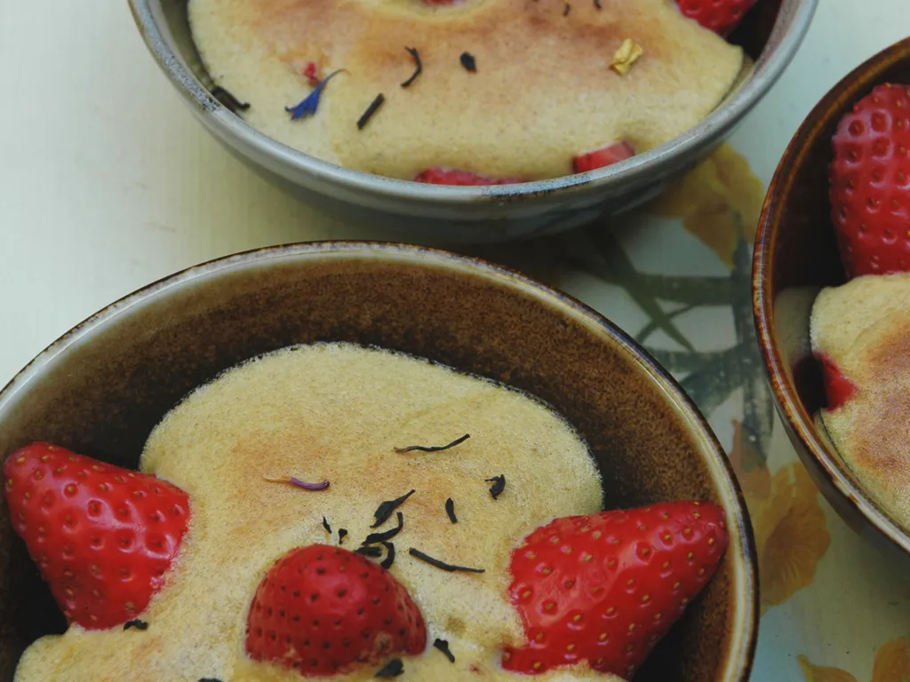 fraises, sucre, jaune d'oeuf, crème, thé