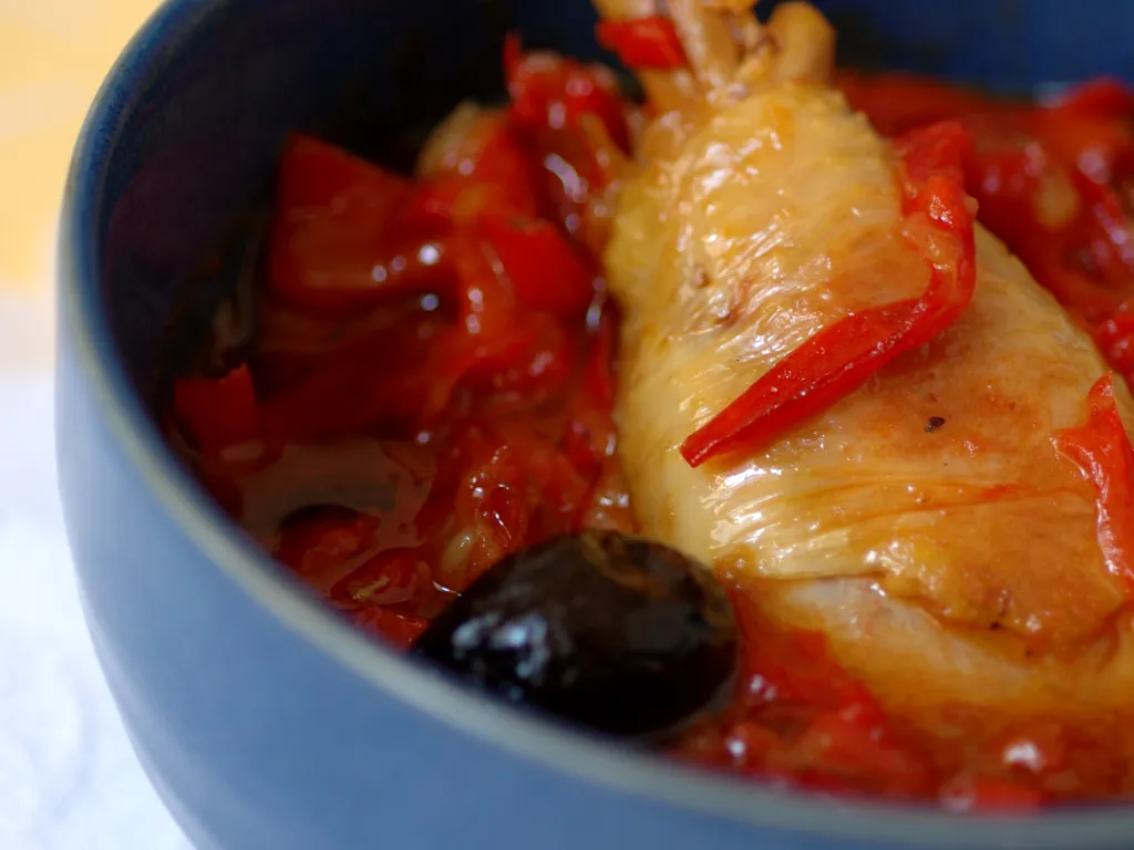 tomate, poivron rouge, ail, cube de bouillon, huile d'olive, thym, feuille de laurier, safran, farine, poivre, sel, poulet, oignon blanc, olives noires