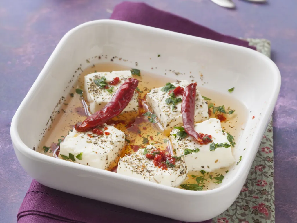mettre les carrés frais dans un plat sur un lit d'huile d'olives (au raz des fromages).