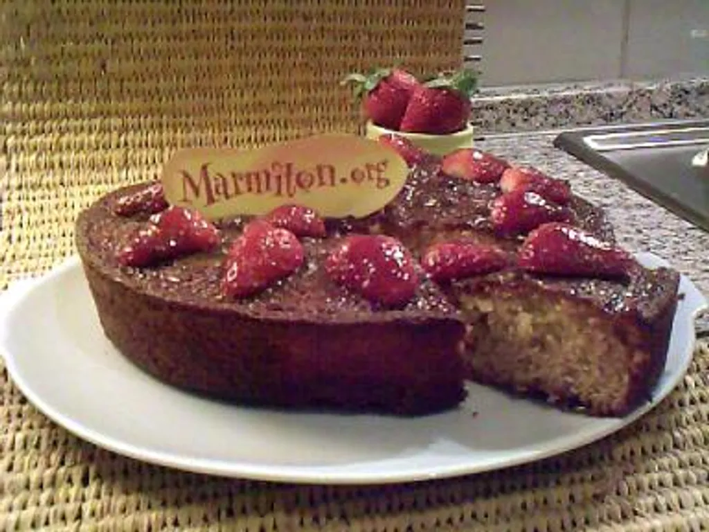 yaourt, farine, sucre, levure, sucre vanillé, vanille, miel d'acacia, confiture de fraises, oeuf