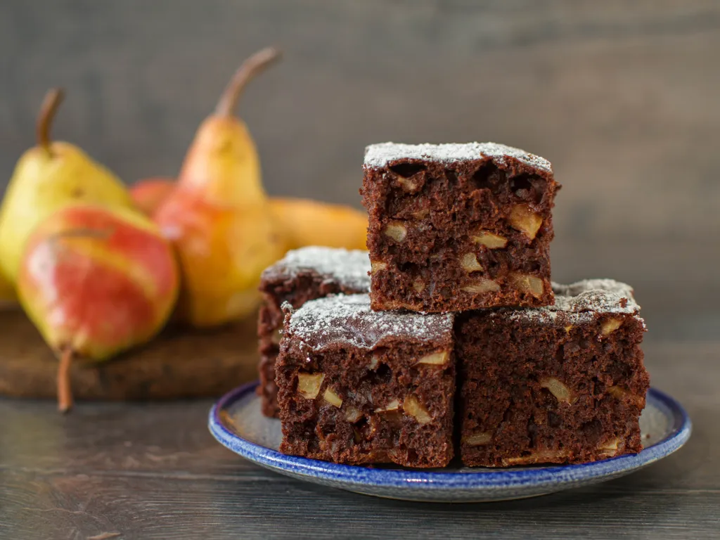 sucre, farine, levure, chocolat noir, oeuf, yaourt nature, poire