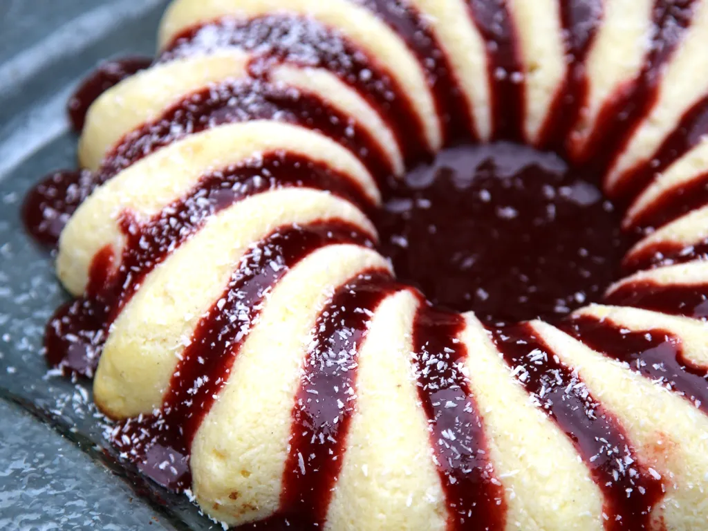 beurre, sucre, citron, noix de coco rapée, vanille, rhum, sel, semoule, lait entier, oeuf, framboises, alcool
