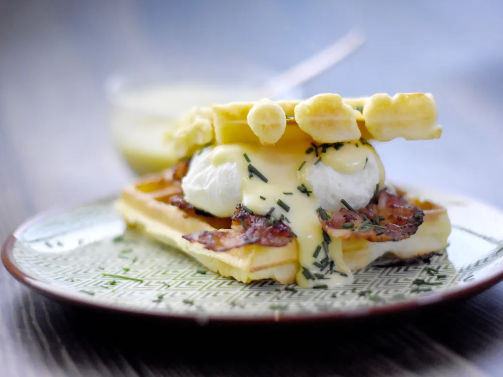 pour le montage : prendre une gaufre, recouvrir d'une tranche de bacon, puis d'un oeuf poché, napper généreusement de sauce hollandaise puis recouvrir à nouveau d'une gaufre.