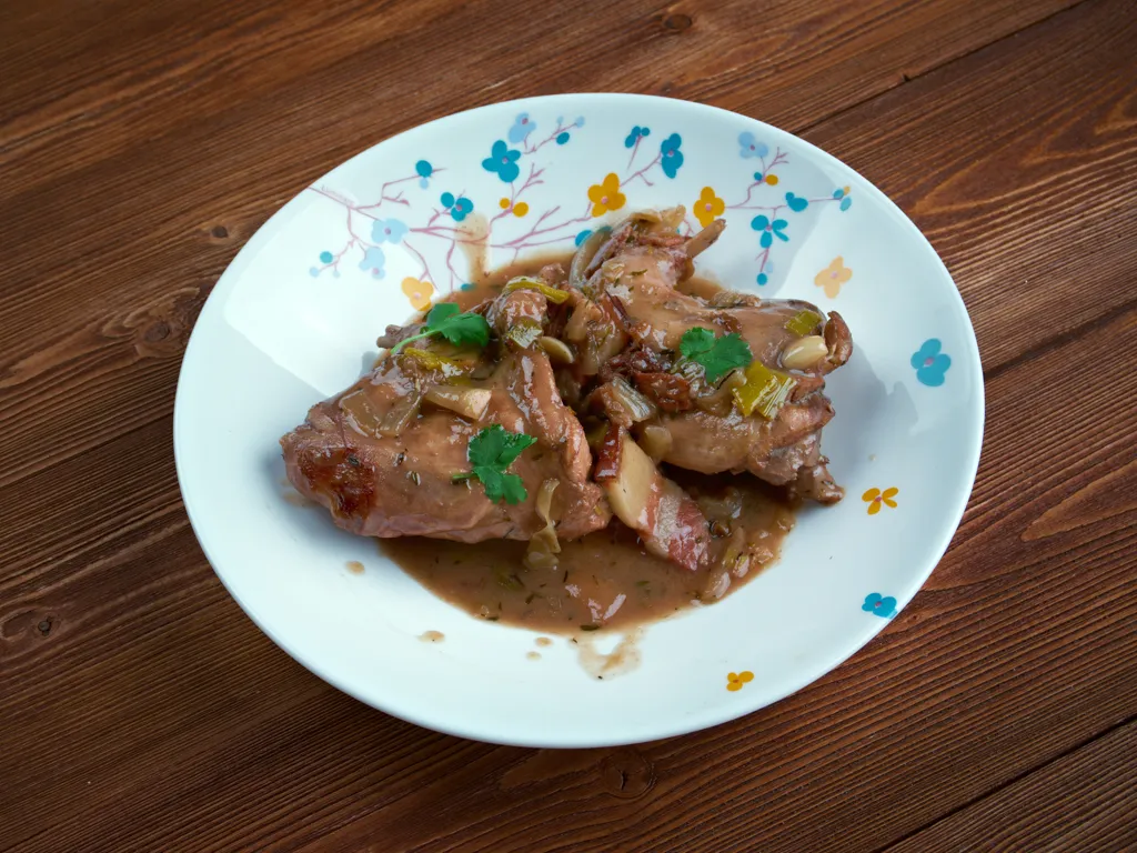 lardons, champignon de paris, vin blanc sec, eau, cube de bouillon, bouquet garni, huile d'olive, beurre, farine, pomme de terre, lapin, oignon blanc