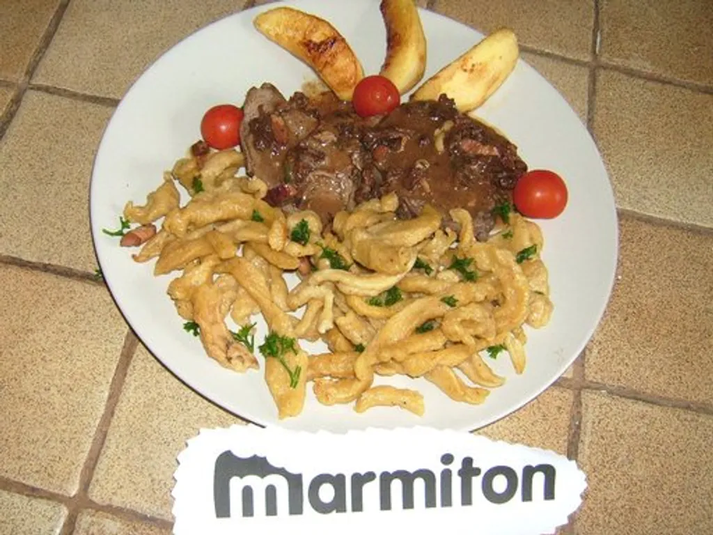 pomme, cannelle, crème fraîche épaisse, jus de cuisson, beurre, fond de veau, oignon, cannelle, thym, feuille de laurier, poivre, chevreuil, lardons fumés