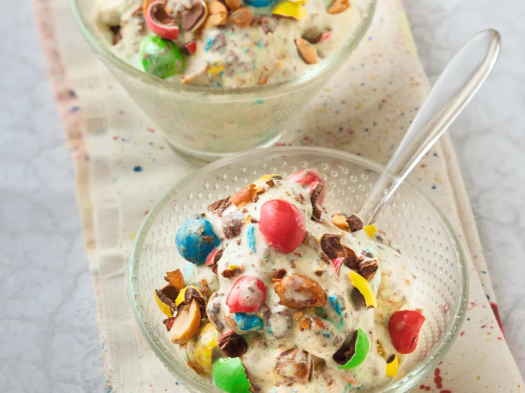 on peut également mélanger m&m's et glace à la sortie de la sorbetière et répartir dans les coupes ensuite!