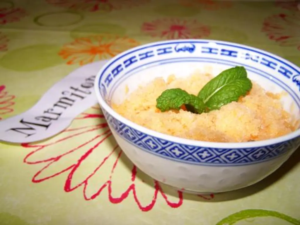 au moment de servir, concassez le granité rapidement à la fourchette afin de lui donner une consistance neigeuse. répartir dans les verres.