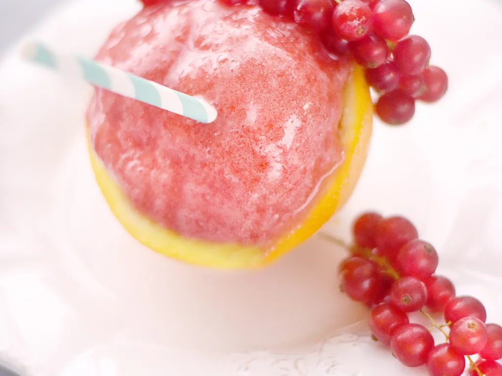 servir dans des coupes bien froides après avoir gratté le granité à l'aide d'une fourchette. décorer de groseilles fraîches.