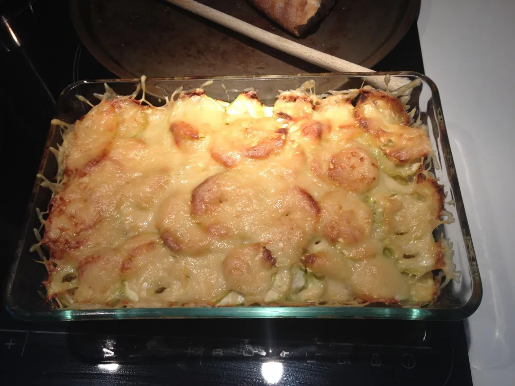 recommencer l'opération jusqu'à épuisement des ingrédients en prenant soin de recouvrir le dessus de fromage avec quelques petits morceaux de beurre.