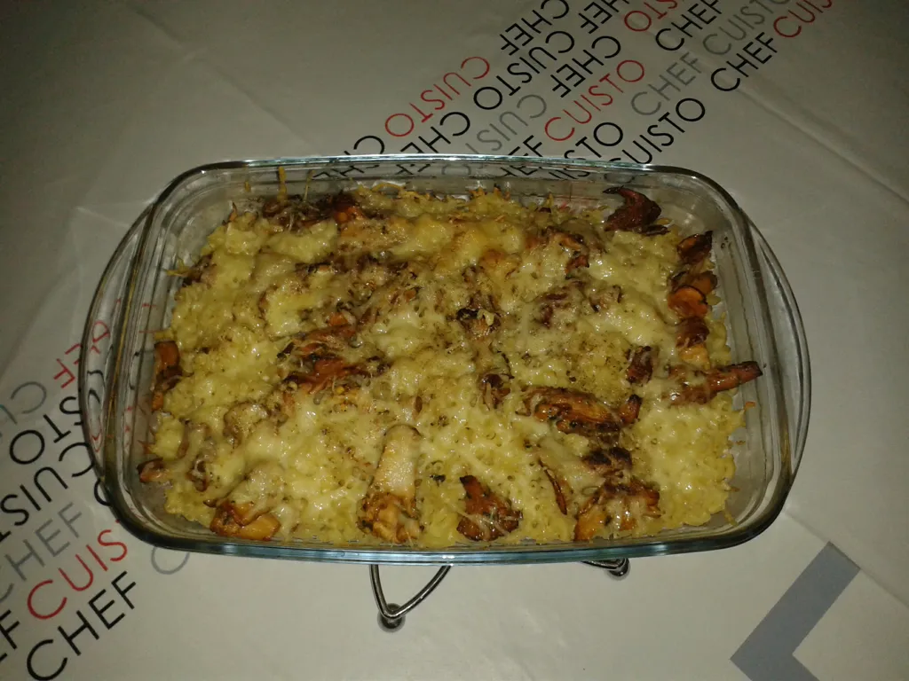 dans un plat à gratin préalablement beurré, verser les pâtes, les champignons, et la préparation à base d’œuf.