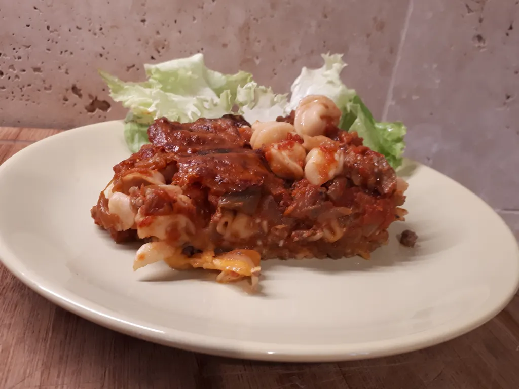 aubergine, oignon, viande hachée, pâtes, emmental, poivre, sel, pulpe de tomate, cheddar, café