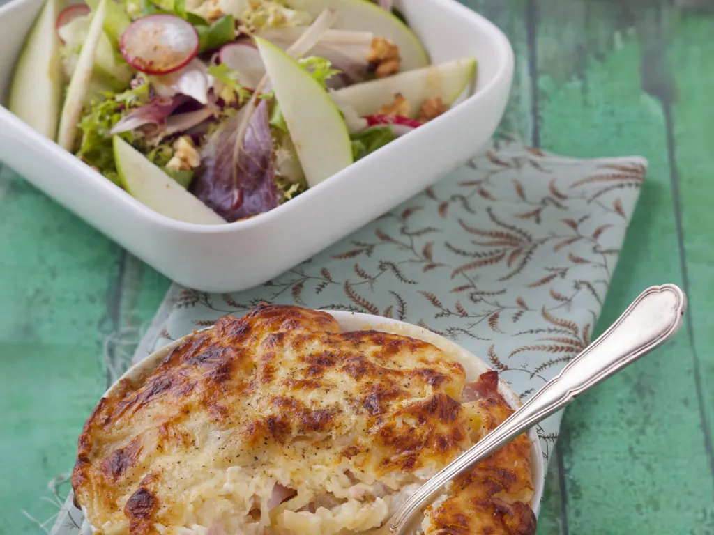 pomme de terre, oignon, moutarde de dijon, crème fraîche, gruyère râpé, lait, poivre, sel, persil, jambon blanc