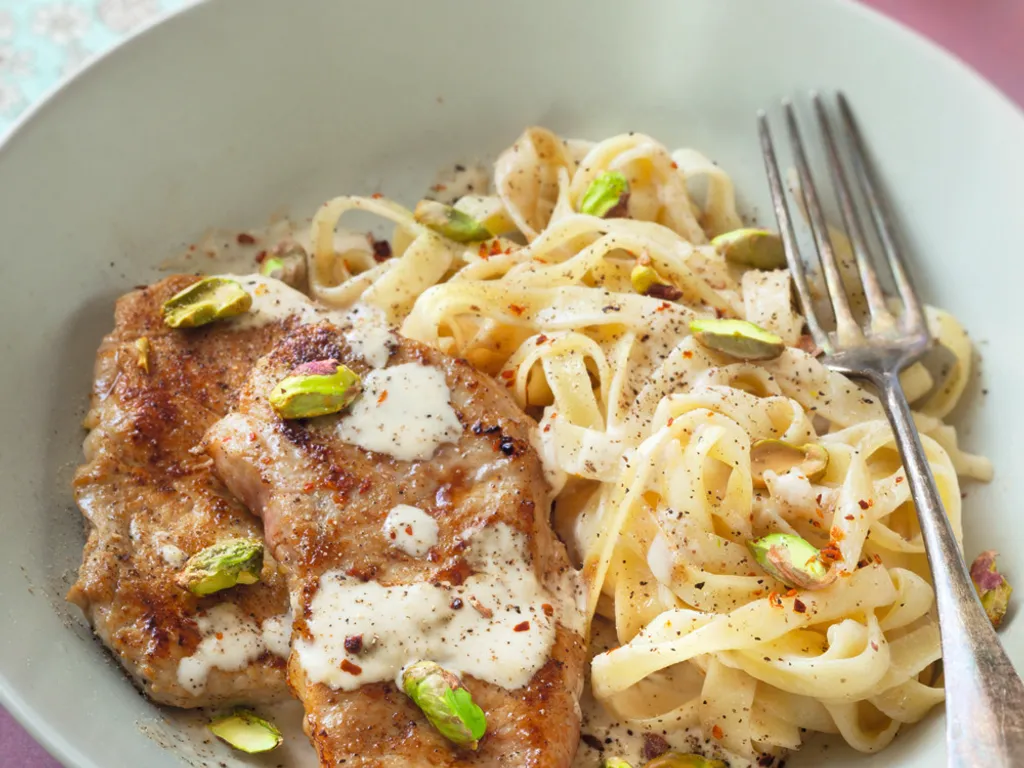 crème fraîche, cognac, pistaches, beurre, poivre, sel, grenadin de veau
