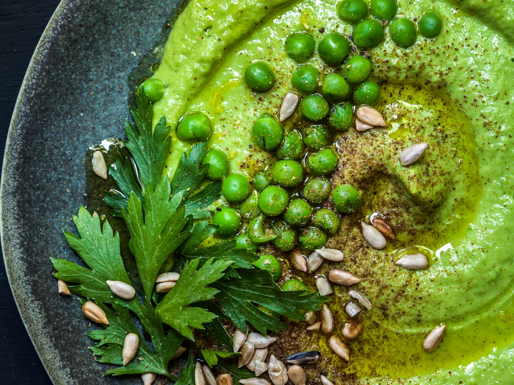 ciselez la menthe, mixez les petits-pois avec le jus de citron, la menthe et le sel et le poivre.