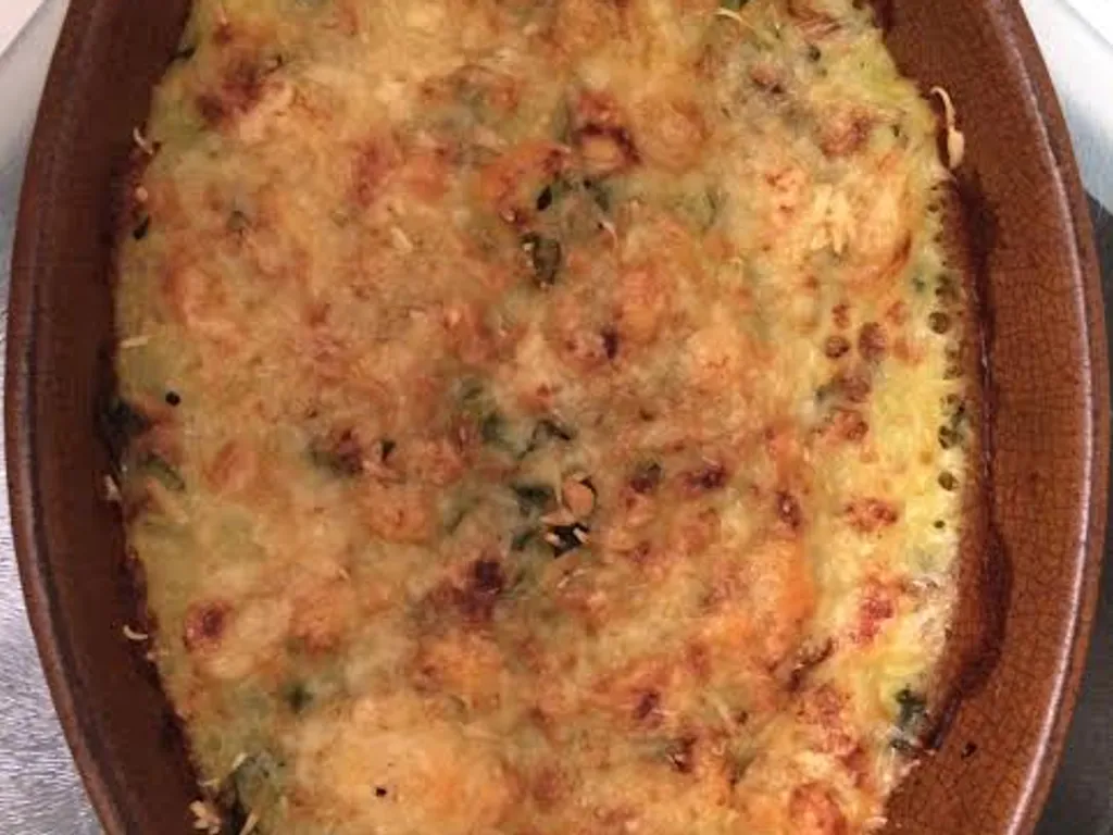 un fois le tout cuit, disposer dans un plat à gratin, écraser les filets de cabillaud puis mettre par dessus la purée de pommes de terre aux courgettes.