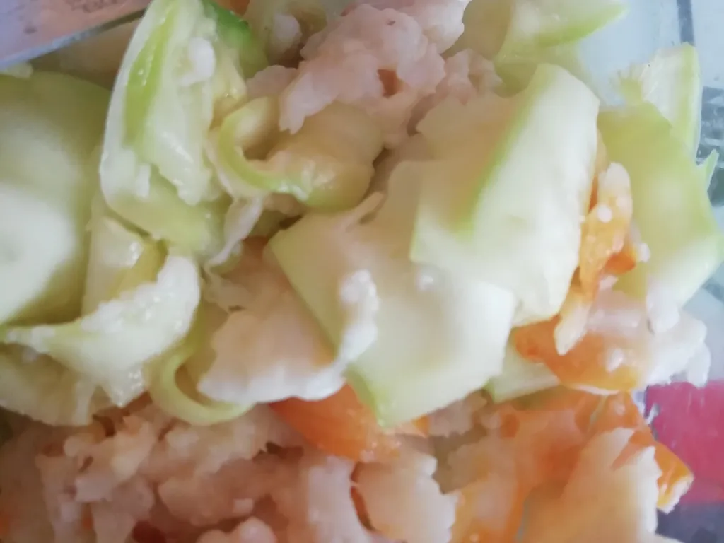 couper en petits dés, la courgette sans l'éplucher, les mettre dans l'assiette avec le haddock.