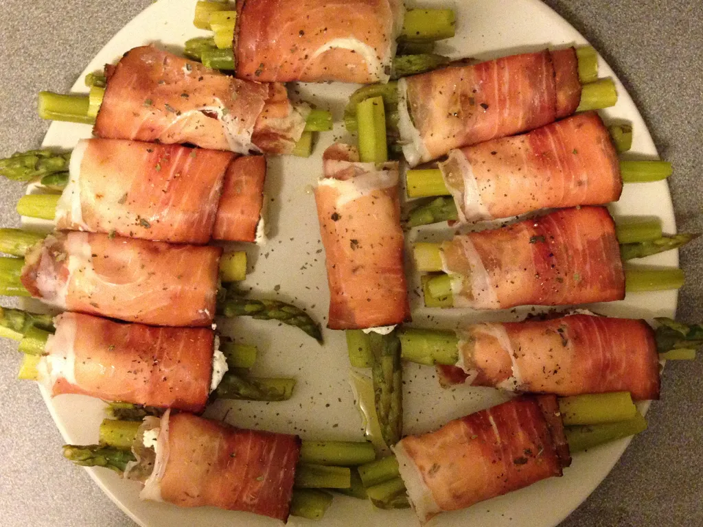 asperge, huile d'olive, jambon cru, fromage frais, poivre 5 baies
