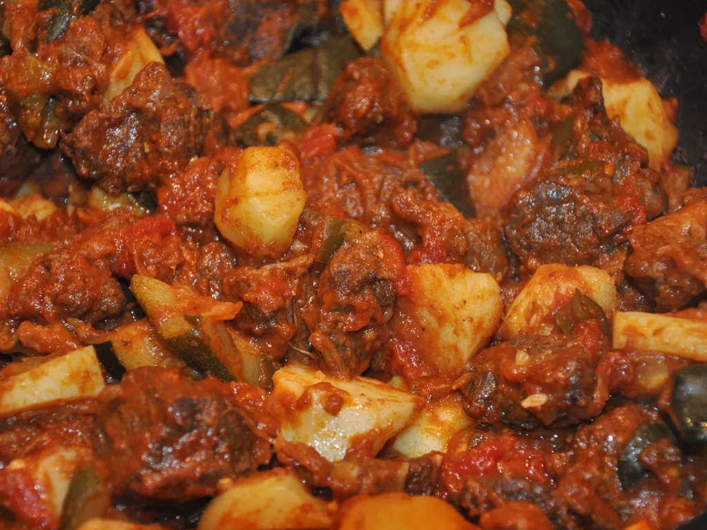 faire revenir la viande coupée en dés assez gros, poivrons, oignons, ail et piment dans une cuillerée à soupe d'huile d'olive.