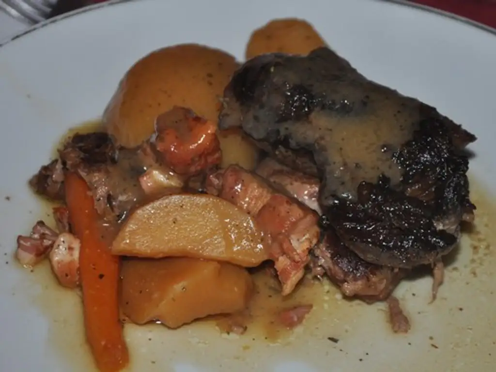 pomme de terre, oignon, poivre, sel, herbes de provence, huile, beurre, joue de porc, lard, cidre