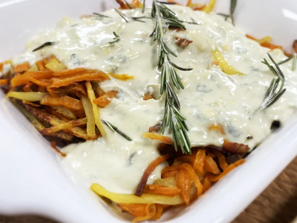 pomme de terre, romarin, huile d'olive, patate douce, carotte violette, fourme d'ambert, crème liquide, sel et poivre