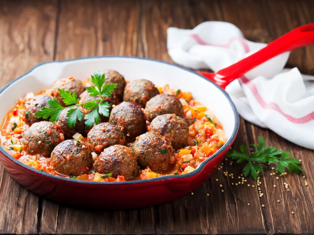 pendant ce temps, mélanger les épices à la viande hachée, la gousse d'ail les oeufs sans oublier le verre de riz. une fois le tout bien malaxé, faire des petites boulettes que l'on rajoute à la sauce. laisser cuire 15 mn, servir avec du riz, des pâtes ou bien encore avec de la semoule....