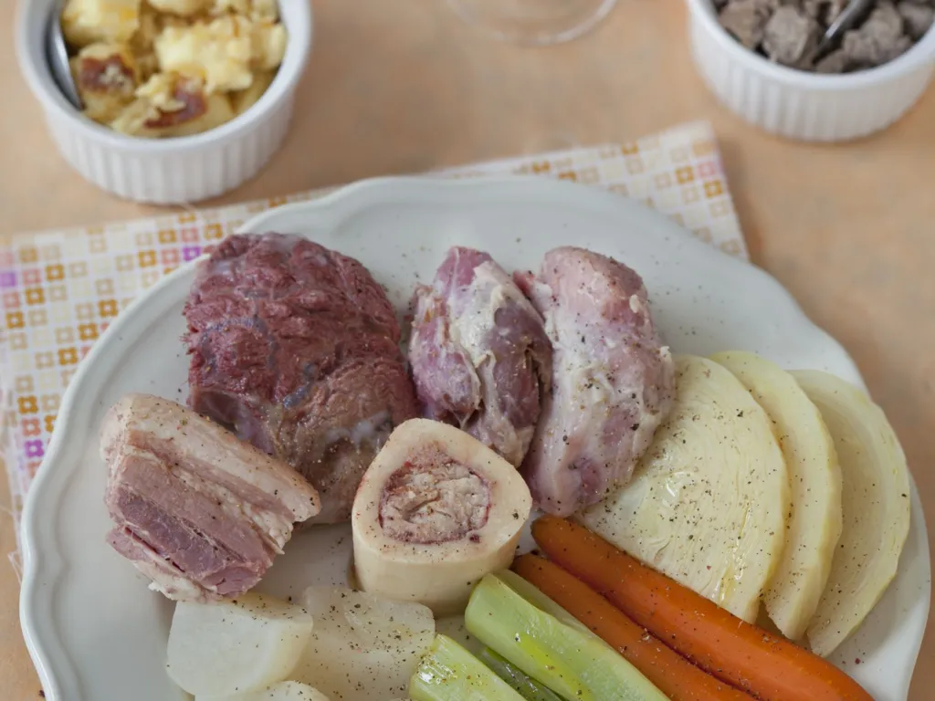 farine de blé noir, sel, bouillon, beurre, oeuf, sucre semoule, farine, lait, oeuf, carotte, poireau, oignon, plat de côte, jarret de boeuf, jarret de porc, lard, chou, navet, beurre demi-sel
