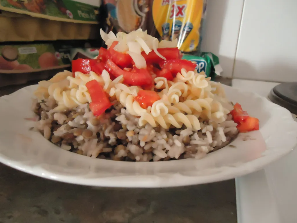 oignon, ail, riz, tomate, poivre, cumin, piment, vinaigre, macaroni, lentilles