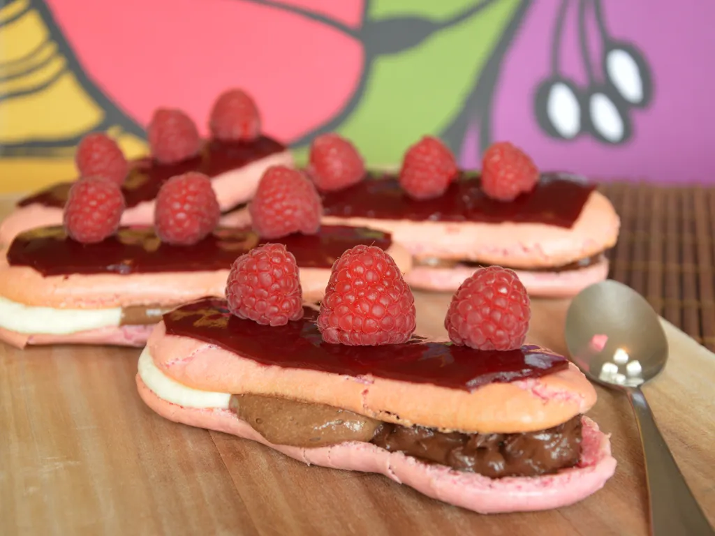 faire le montage des éclairs et décorez de framboises.