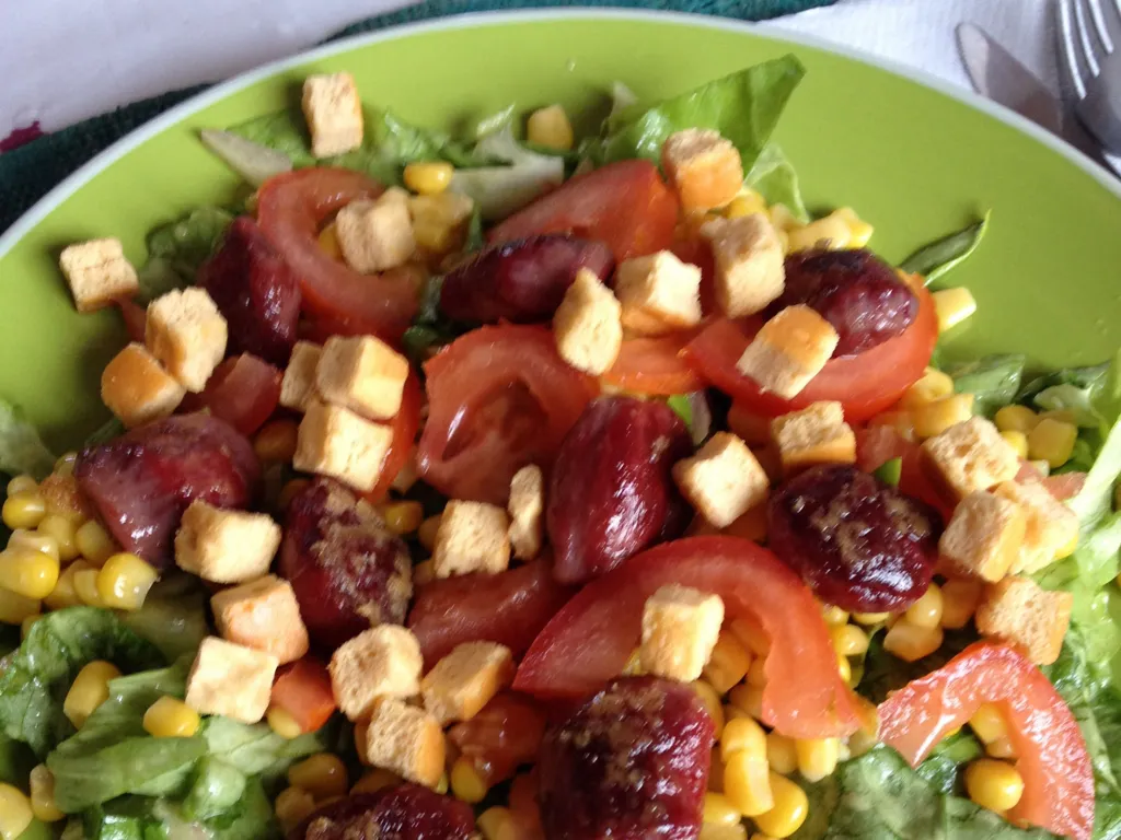 tomate, noix, moutarde, vinaigre de framboise, poivre, sel, magret de canard, gésiers, salade, maïs, huile de noix