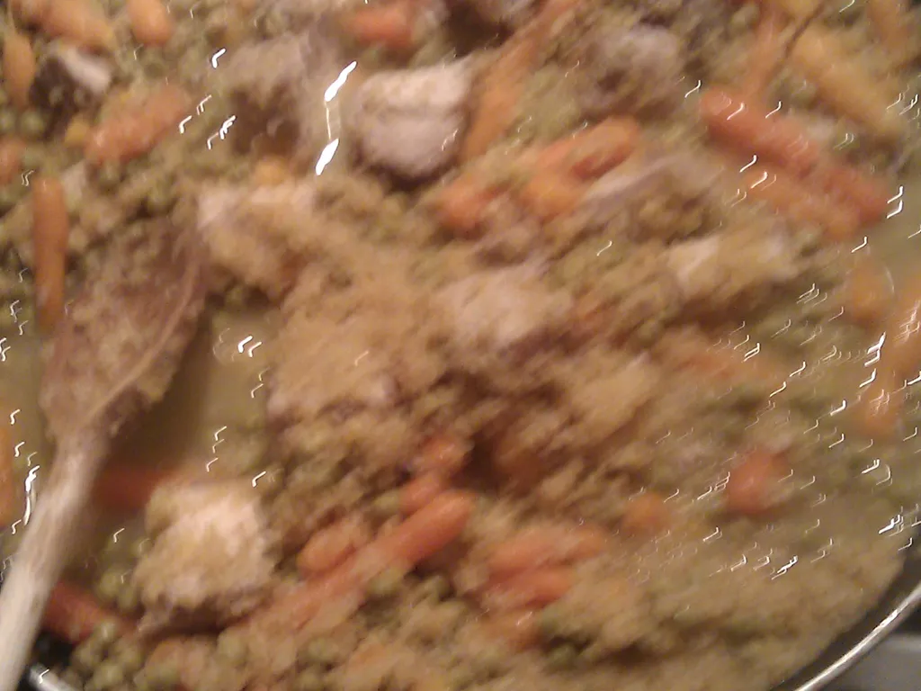 après quelques minutes, remuer et ajouter un second tiers, puis ajoutez les légumes et la viande, que vous aurez pris soin de découper en morceaux de taille raisonnable.