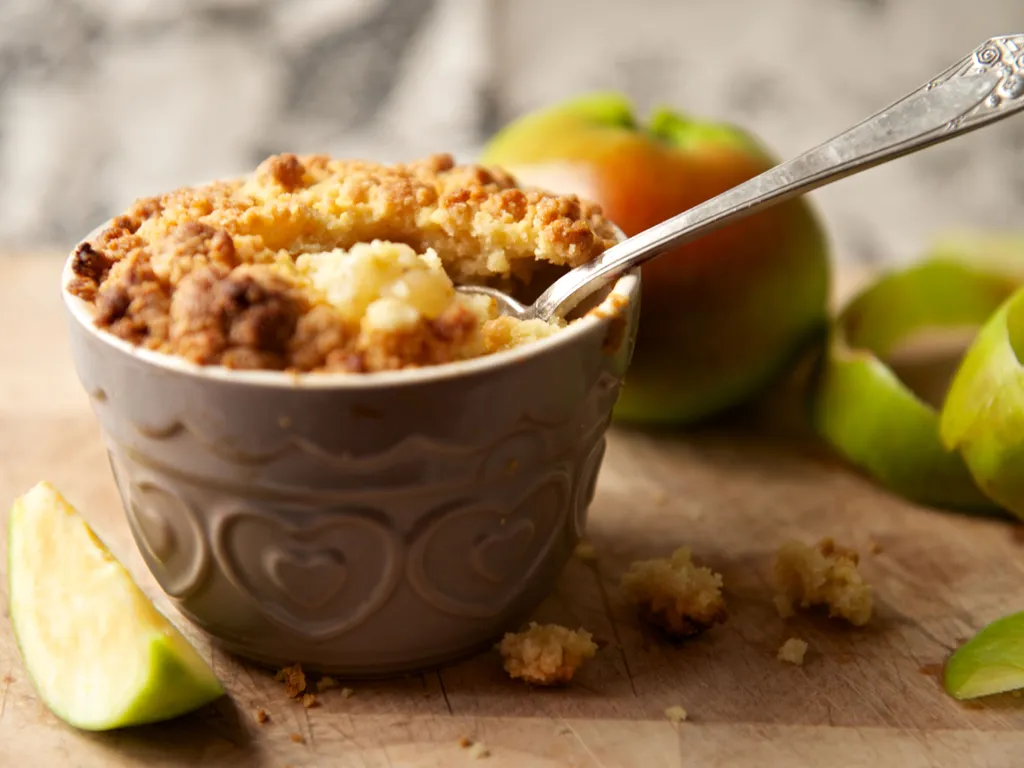 1) découpez la pomme en gros morceaux et tassez-moi bien tout ça dans un ramequin.