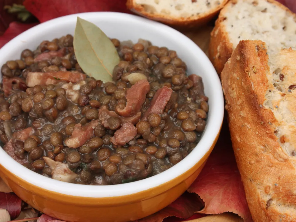 oignon, lardons, crème fraîche, lentilles
