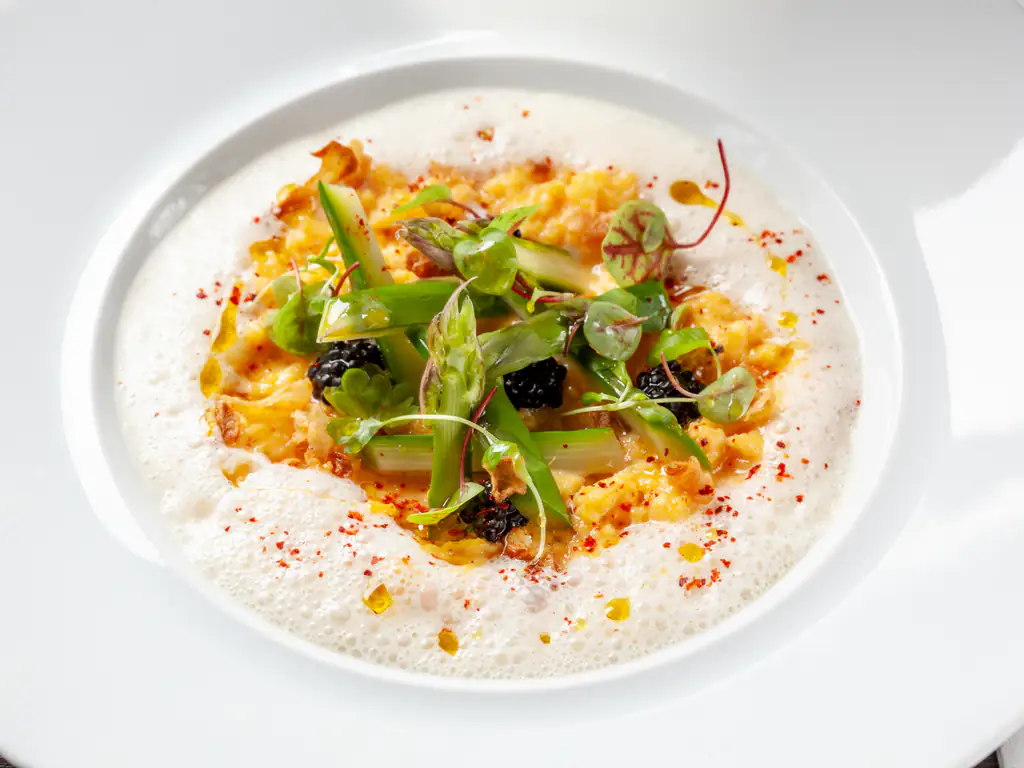 beurre doux, asperge verte, fleur de sel, piment d'espelette, parmesan, fleur de sel, huile d'olive, oeuf