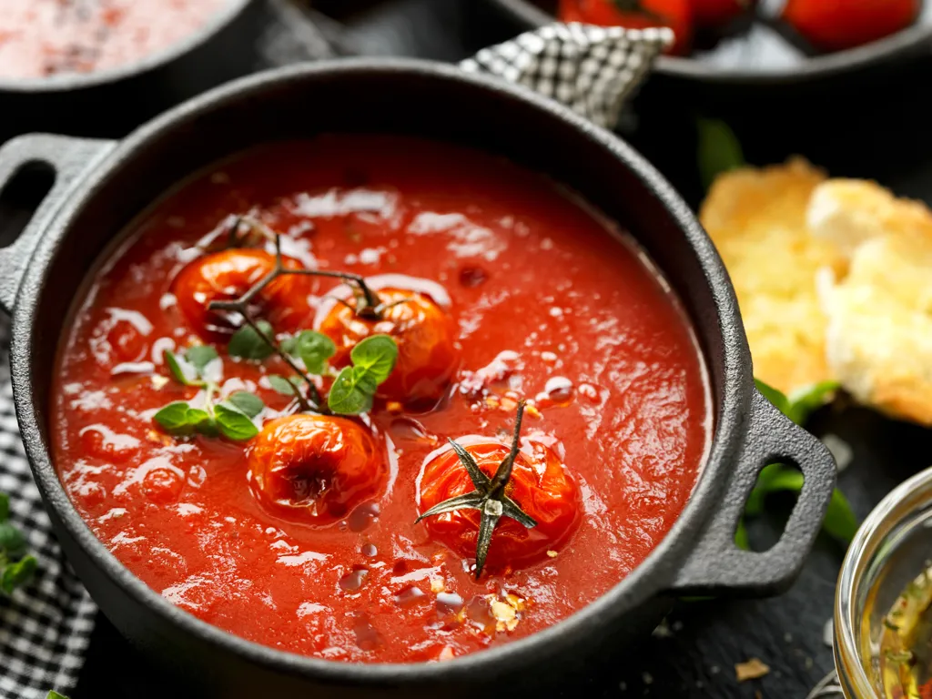 tomate, huile d'olive, basilic, oignon, sucre, bouillon de boeuf, gros sel