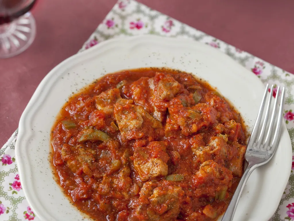 huile d'olive, poivron vert, oignon, ail, tomate, vin blanc, porc, bouillon de poule