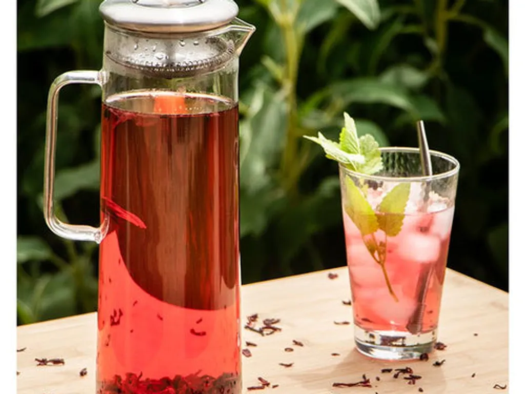 thym, fleur d'hibiscus, glaçons, jus citron, feuillet
